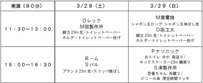 | 15:00~16:30 | R-ム Sバル ブランコ25m走/スリッパ跳ばし | Pナソニック おトイレ ゆか 宙返り/ キックスケーター25m綱渡り S津製作所 恐竜ちゃん 缶蹴り/ ビニール傘 滞空時間マッチ |