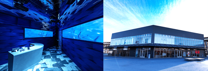 店内には、サラブレット魚やニホンウナギの水槽を設置し、実際のいけすで使用している網を装飾に用いているほか、映像や光・音響によって海底をイメージした空間を演出しています。看板メニューである「近大サラブレッド魚と近大マグロの紅白手桶寿司」(数量限定)と、「近大ブリヒラのぶどう山椒焼き」「近大産チョウザメの香味揚げ」は、本店舗だけで提供する限定メニューです。