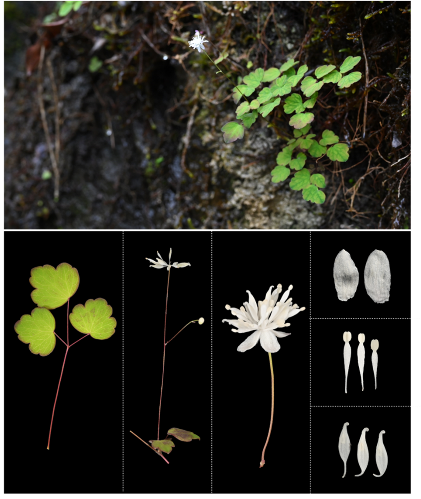 沖縄島北部の「アキカラマツ」は、1997年に琉球大学理学部(当時)の横田昌嗣名誉教授によって初めて沖縄生物学会誌に報告されました。一般にアキカラマツは、海岸から高山帯にかけての明るい林縁部などに生育しますが、不思議なことに沖縄島のアキカラマツは、水が滴る滝の壁面という全く異なる環境に生育していることが報告されていました(図1)。さらに、沖縄島の個体はその他の地域のアキカラマツと比べて植物体が非常に小さいことも特徴的でした。沖縄島には他にカラマツソウ属植物は分布しておらず、基本的に温帯地域に分布するカラマツソウ属植物が亜熱帯地域である沖縄島から報告された事自体が奇妙なことでした。