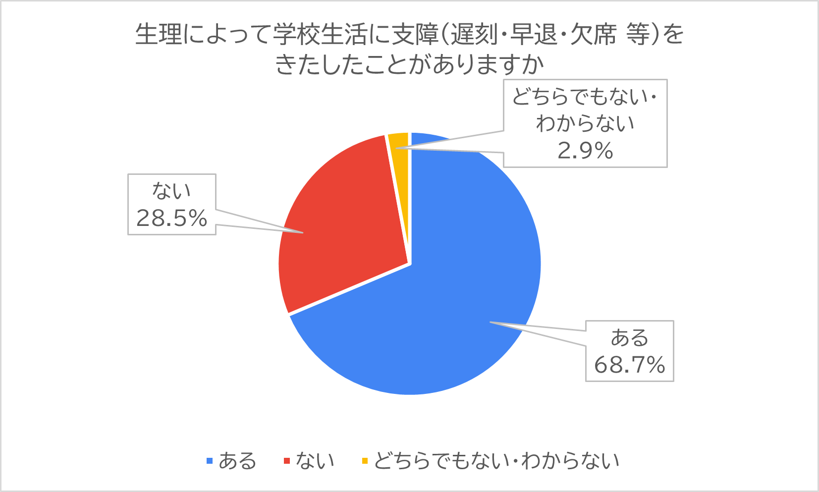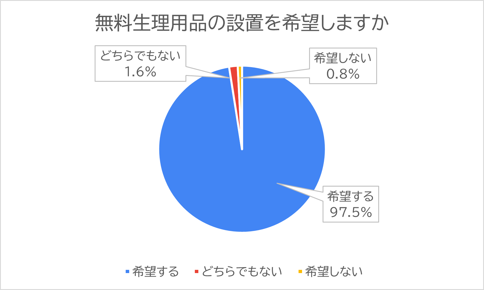 試行期間中に実施したアンケート調査では、延べ485件の回答が集まり、そのうち97.5%が無料生理用品の設置を希望するという結果になりました。また「突然生理がきて困った経験がある:97.5%」「生理によって学校生活に支障(遅刻・早退・欠席 等)をきたしたことがある:68.7%」「生理用品は高いと感じる:76.1%」という結果から、生理による学校生活への影響や生理の貧困等の問題が見えてきました。