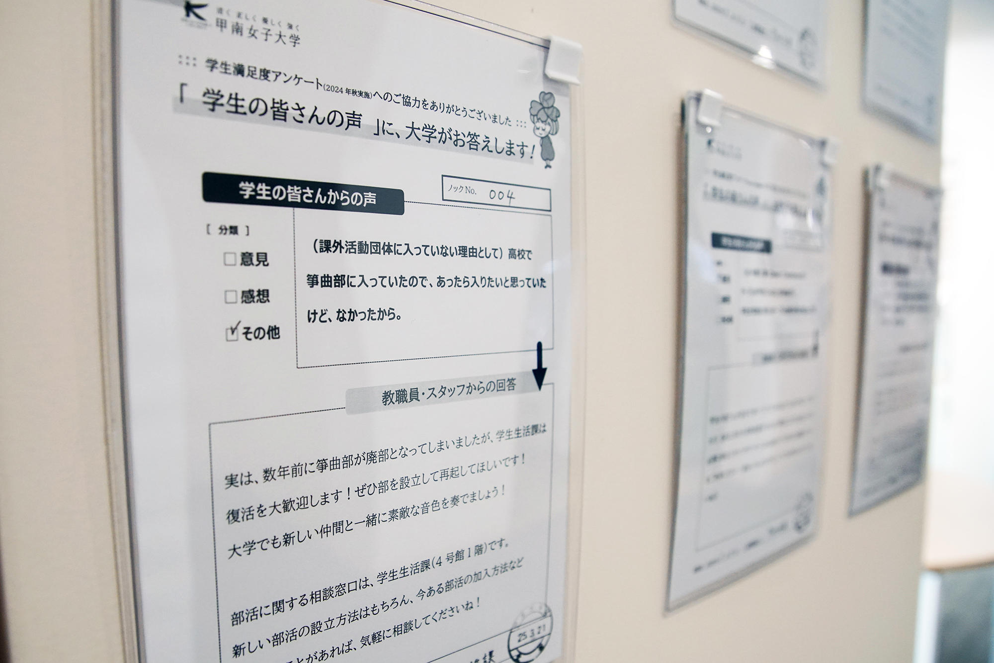 甲南女子大学では、学生満足度調査アンケートを通じて寄せられた学生の声に教職員・スタッフが回答、改善活動を行う「改善100本ノック」を展開しています。この取り組みは、学生満足度を高めるための大学と学生の双方向コミュニケーションとして実施されるものです。2025年度には、アンケート結果報告リーフレットを全学生に配布する予定です。