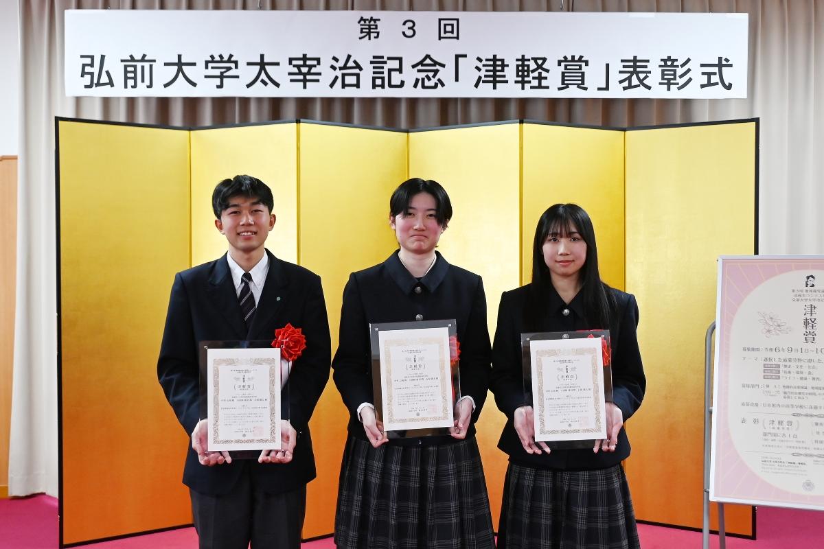 選考の結果、個人部門では山形県立谷地高等学校 3年の東海林彩華さん、グループ部門では青森県立五所川原農林高等学校 3年の中里心南さん、2年の小田桐優羽さん、石岡慶太さんのグループに、最優秀賞である津軽賞をそれぞれ授賞。3月26日に2組を弘前大学に招待し、表彰式を執り行った。