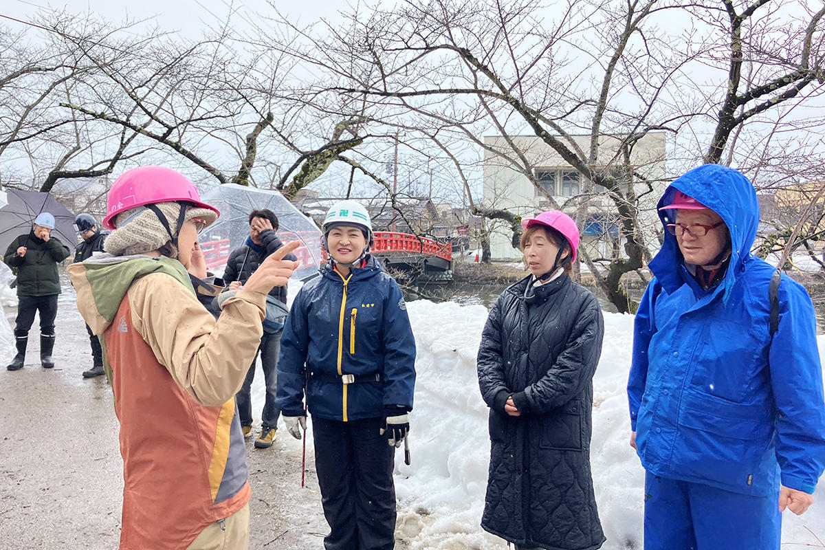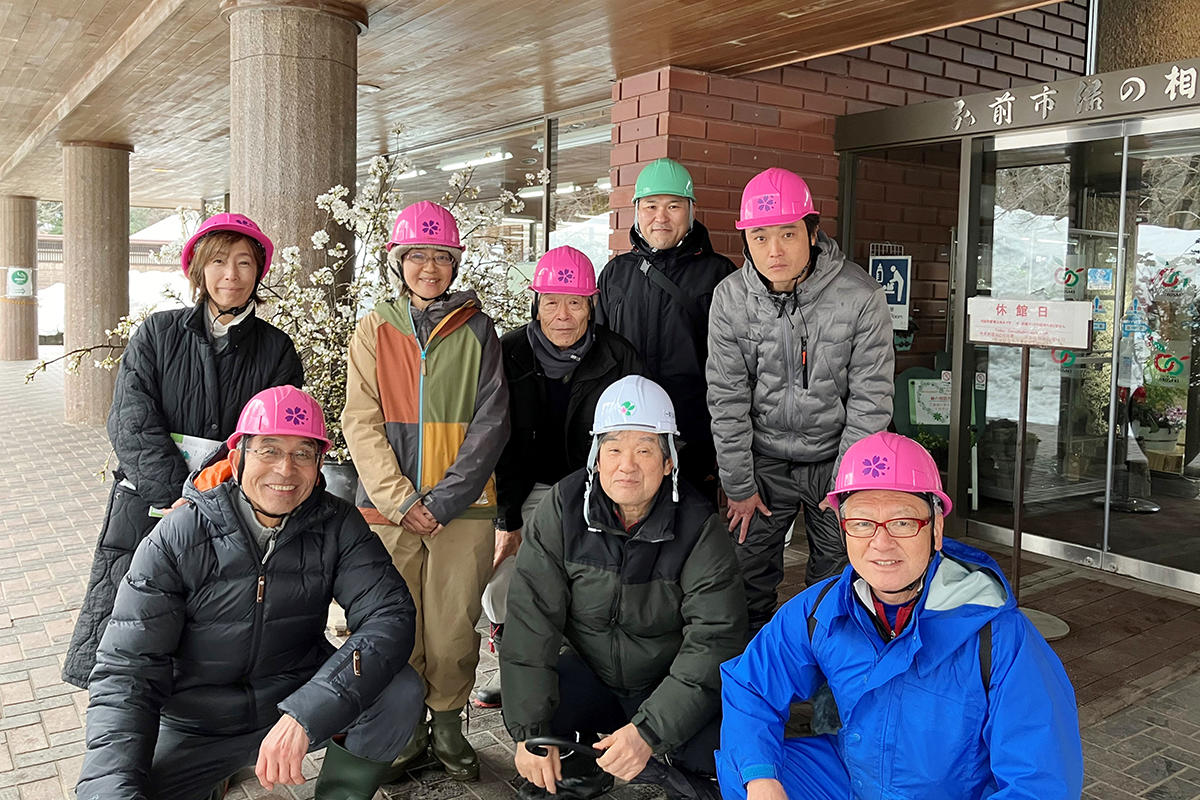 3月21日には、弘前市公園緑地課主幹の橋場真紀子氏から桜の剪定作業に関するアドバイスを受け、同園の桜樹木の剪定作業を見学。当日はあいにくの雨模様ではあったが、日本一の桜と称される弘前公園の桜の管理技術について、メンバーから専門的かつ具体的な質問が多数寄せられた。