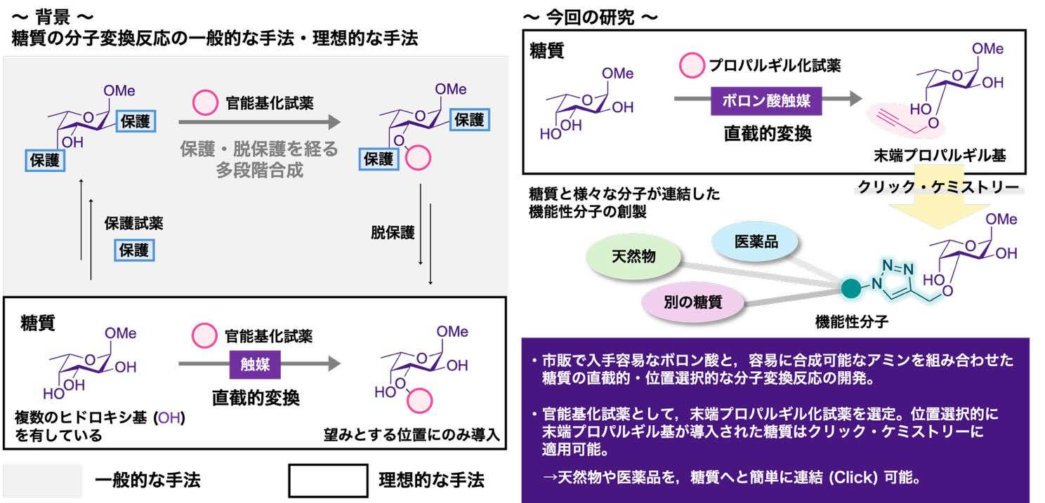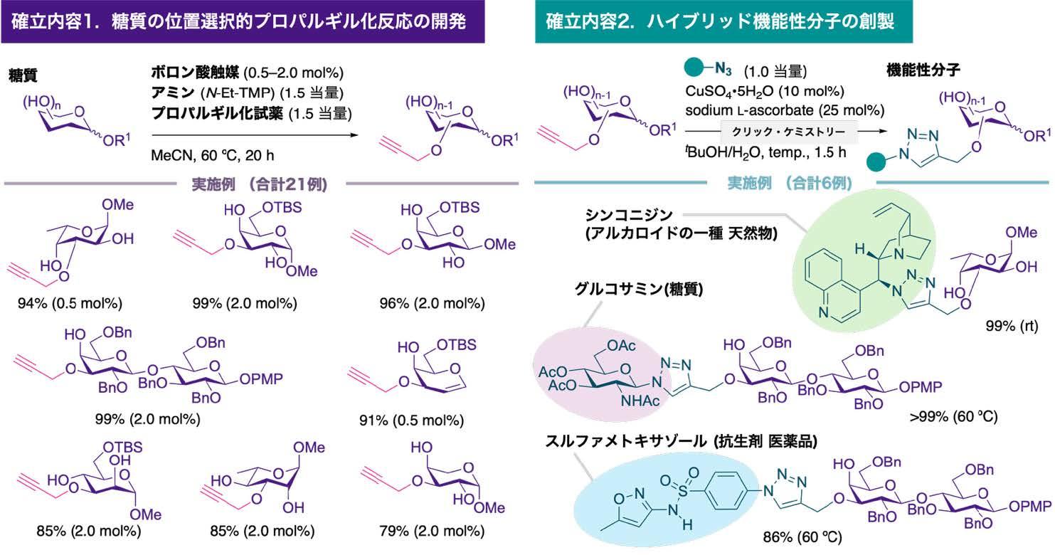 研究グループは,入手が容易で扱いやすいボロン酸触媒*2と,容易に調製可能なアミンを組み合わせることにより,狙ったヒドロキシ基だけを反応させて,末端プロバルギル基*3 と呼ばれるクリック・ケミストリー*4 へ容易に展開可能な官能基を導入することに成功しました。末端プロバルギル基を利用したクリック・ケミストリーの実験で,糖質同士の連結や糖質-医薬品ハイブリッド型機能性分子*5を創製することにも成功しました。