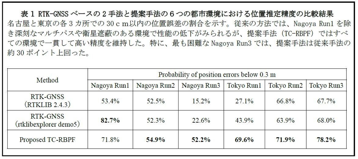 次に、実際に、名古屋および東京の計6箇所の都市環境において実車データを用いた検証を行いました(図2)。結果として、提案手法は過酷な都市環境において、従来のRTK-GNSSを上回る精度と有効性を実証しました(表1)。 【今後の展開】