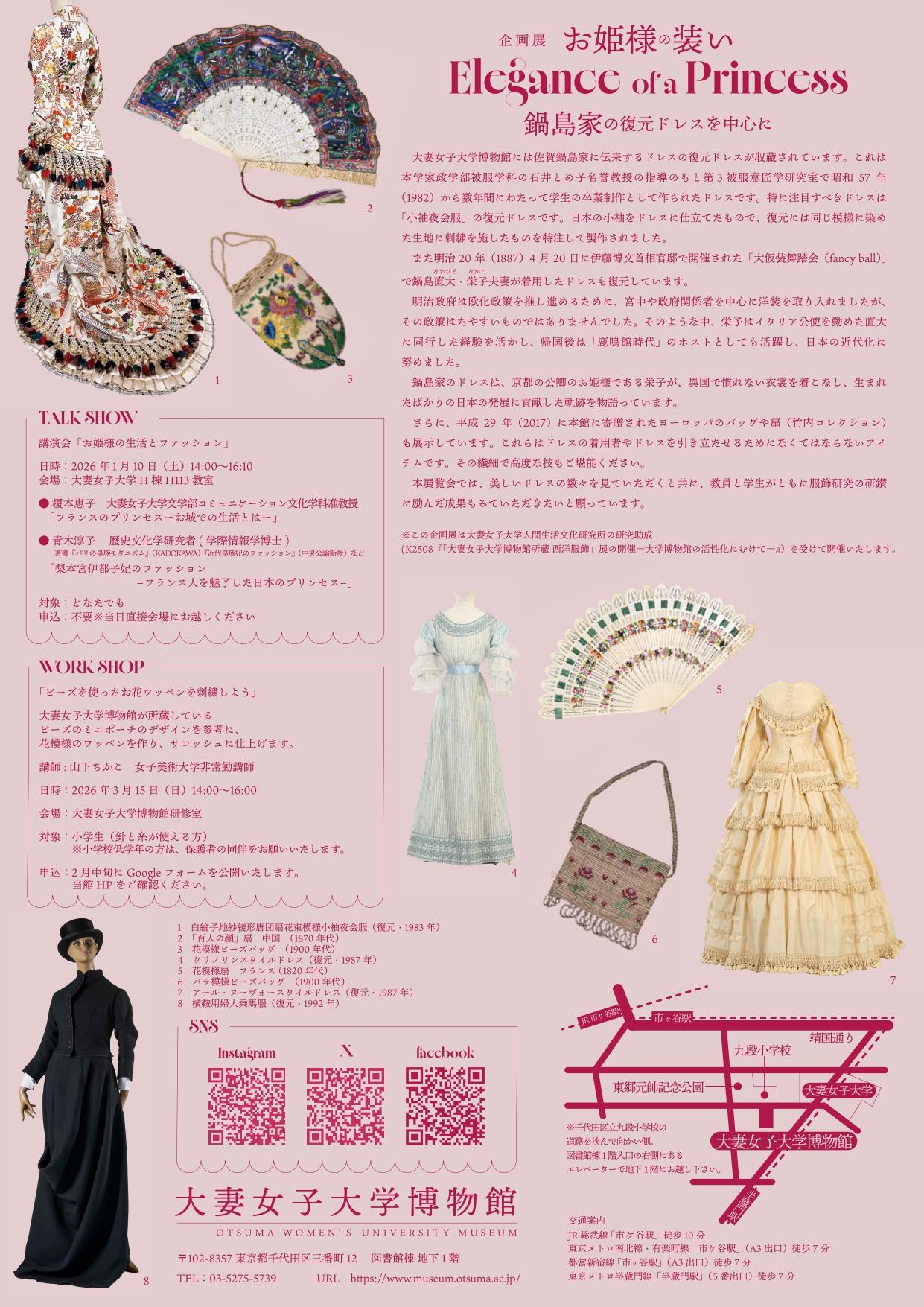 大妻女子大学博物館(東京千代田区)は2026年1月7日(水)~3月19日(木)まで、企画展「お姫様の装い Elegance of a Princess ― 鍋島家の復元ドレスを中心に ―」を開催する。同博物館には、明治20年の「大仮装舞踏会(fancy ball)」で着用されたドレスを復元したものなど、佐賀・鍋島家に伝来するドレスの復元ドレスが収蔵されている。今回の企画展では、数々の復元ドレスや各アイテムの展示を行うほか、関連イベントとして1月10日(土)に「お姫様の生活とファッション」がテーマの講演会、3月15日(日)に小学生対象のワークショップを実施する。いずれも入場(参加)無料で、企画展と講演会は申込不要、ワークショップは事前申込が必要。