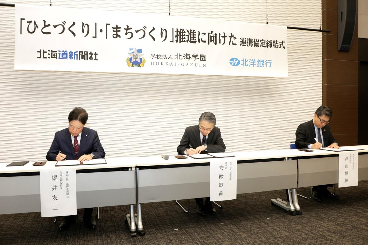 北海学園大学などを運営する学校法人北海学園(札幌市豊平区、理事長:安酸敏眞)は12月10日、株式会社北海道新聞社(代表取締役社長:堀井友二)および株式会社北洋銀行(頭取:津山博恒)と「ひとづくり」・「まちづくり」推進に向けた連携協定を締結した。
