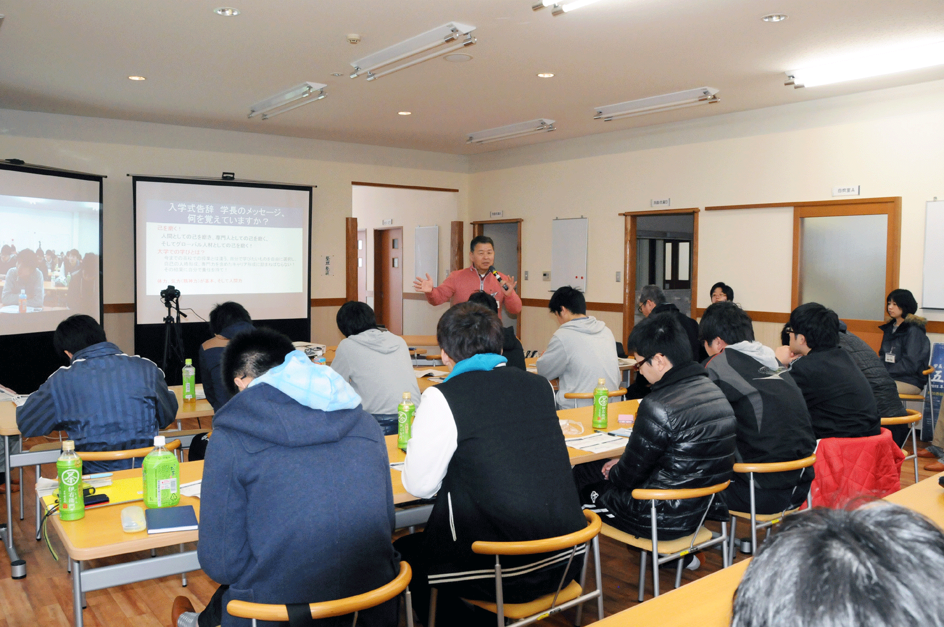 合宿初日は座禅体験の後、学長が大学で学ぶことや己を磨くことの重要性を講義し、その後こきりこ節や麦屋節(五箇山地方に伝わる民謡)などの郷土芸能を体験した。2日目にはかんじき体験の後、学生が1~2名に分かれてそれぞれの民泊先で雪かきなどの勤労奉仕を行った。学生らは3日間をとおし、五箇山の伝統文化や暮らしを体感し、「人間力」の重要性について学んだ。