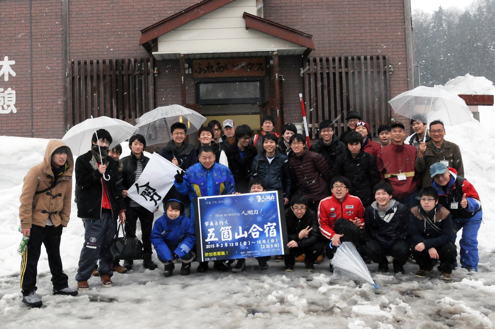 「人間力強化プログラム」とは、金沢大学が学生の人間力強化を図るために開始した学長主導型の教育プログラムで、今回の「学長と行く五箇山合宿」は、昨年8月の「学長と行く能登合宿」、11月の「角間の里山 下草刈り編」に続き第3回目となる。己を鍛え、己を磨き続ける学生生活を送るために、仲間と苦楽をともにする環境のもと、知力・精神力の重要性と多様な価値観の存在、社会の構成員の一人であることを認識することを目的として実施された。