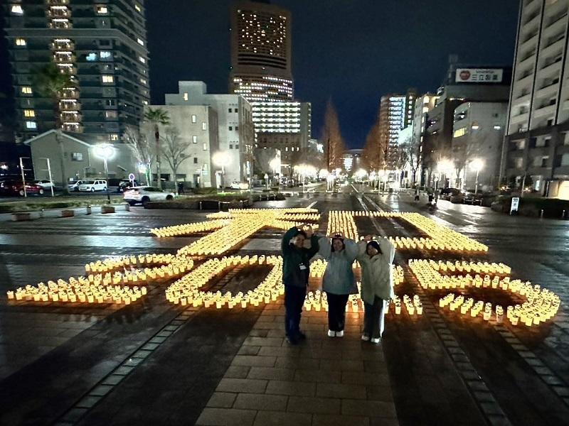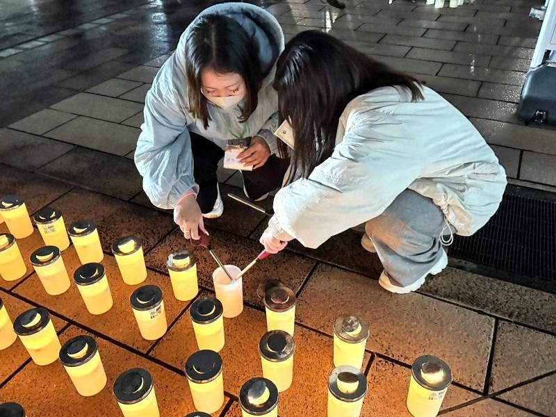 会場では、被災者が早く和やかな生活を取り戻せるようにという思いを込め『和』の文字になるよう約3,000本のキャンドルを並べ、学生やボランティア団体、来場者がキャンドルひとつひとつに火を灯しました。