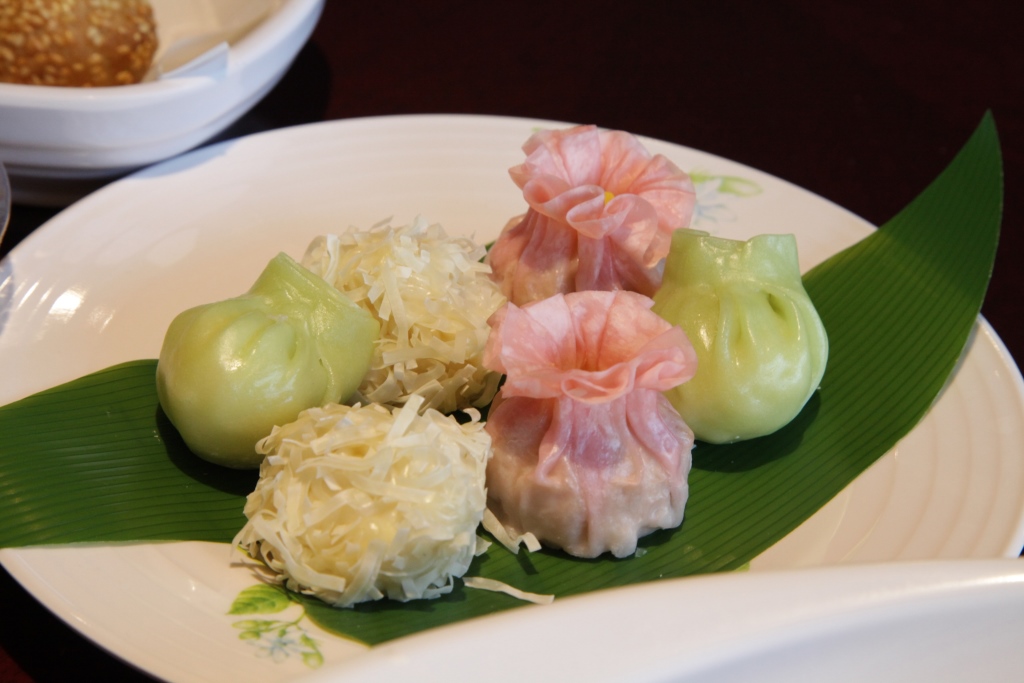 中国プレートに水餃子、白身魚薬味ソースかけ、棒棒鶏、デザートに桃饅頭、ゴマ団子、フルーツ白玉を用意