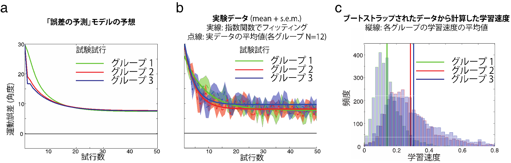 行動実験: 実験協力者にはマニピュランダムと呼ばれる機械を右手で握り、マニピュランダムの位置に対応して画面に表示されているカーソルを操る課題を行ってもらった(図1a)。本課題では、カーソルを画面上のターゲットに向かって適度な速度で真っ直ぐ動かしてもらう。ターゲットに到達できたときには爆発音が鳴る。初めに学習試行を210試行経験してもらい、次いで10試行の脱学習試行を、最後に50試行のテスト試行を経験してもらった(図1b)。テスト試行では突然、カーソルが思った以上に右方向にずれてしまう新奇な環境へと変化する(図1a、半数の実験協力者には右にずれてしまう環境を、半数の実験協力者には左にずれてしまう環境を経験してもらった)。突然の変化が生じた直後には、カーソルをターゲットに真っ直ぐ動かすことができなくなってしまうものの、練習を重ねるうちに自ずと再び課題を達成することができるように学習することができる。後述する学習試行を用い、これから実行する運動の誤差が予測しやすいか否かがどのようにテスト試行の振る舞いに影響を及ぼすのかを検証した。既存の運動学習のモデルの予想は、誤差が予測しやすいか否かは全くテスト試行の振る舞いに影響しないというものであるが、研究チームが提案した「誤差の予測」モデルの予想は、誤差が予測しやすい学習試行を経験した実験協力者ほど、テスト試行において素早く課題を達成することができるようになるというものである。