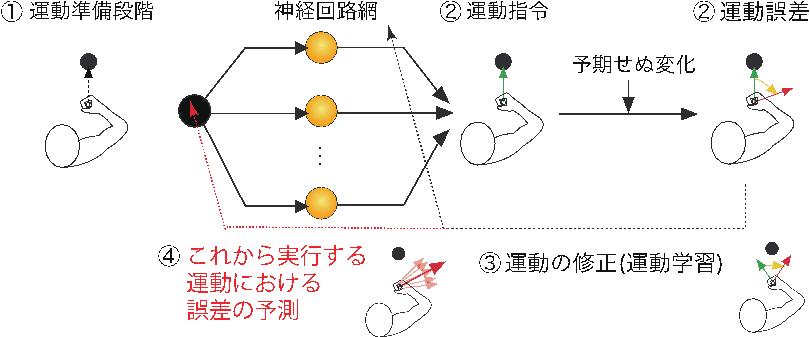 数理モデル: 運動指令を出力する神経回路網モデルを構築した。特に、「誤差の予測」が運動の準備段階における各素子の活動を決定する神経回路網モデルを構築した。具体的には以下の1-4の手順を繰り返し数値シミュレーションを行った(図3)。1(運動準備段階):これから実行する運動における「誤差の予測」が神経回路網モデルの各素子の活動を決定する。 2(運動実行):運動を実行し、それに伴い運動誤差を観測する。 3(運動の修正):運動誤差を小さくするように運動指令を修正する。 4(誤差の予測):現状での「誤差の予測」と観測した運動誤差とを組み合わせ、次に実行する運動における誤差を予測する。
