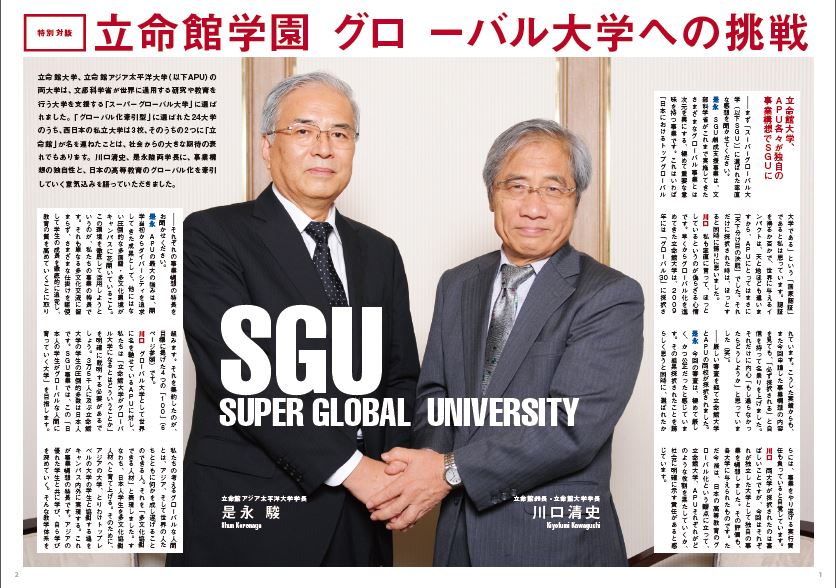 「スーパーグローバル大学(SGU)」に同一法人から唯一、立命館大学と立命館アジア太平洋大学(APU)の2大学が採択されたことを受けて、川口清史学長(立命館大学)と是永駿学長(APU)が「SGUと今後の大学の国際戦略」をテーマに対談を行った。対談の内容を両大学のSGU構想のポイント紹介と共に公開した(PDFデータ)。