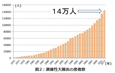 潰瘍性大腸炎とは、特にストレスが原因で炎症反応の暴走が起こり、その結果大腸に広範な潰瘍が起こる病気である。患者数は2012年現在14万人余りで、1970年代以降著しく増加傾向にある(図2)。現状では「メザラジン」、「ステロイド」及び「抗TNF-α抗体」などの薬剤しか治療法がなく、これらの効果がない場合、大腸の切除や人工肛門での生活を余儀なくされるため、新たな薬剤治療法の開発が期待されている。本研究では、褐藻類シワヤハズに由来する化合物である「ゾナロール」が、潰瘍性大腸炎の原因と考えられる炎症反応の暴走を抑制する効果について検証を行った。