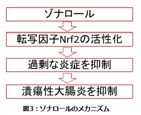 マウスの潰瘍性大腸炎モデルを用いてゾナロールの潰瘍性大腸炎の抑制作用を検討したところ、ゾナロールの経口投与は、大腸における潰瘍を有意に抑制することを新たに発見した。また、ゾナロールは試験管内での炎症反応も有意に抑制した。これは、ゾナロールが転写因子Nrf2(※4)の活性化に作用し、炎症反応を抑制した結果、大腸の潰瘍の発生を抑制したことを示している(図3)。