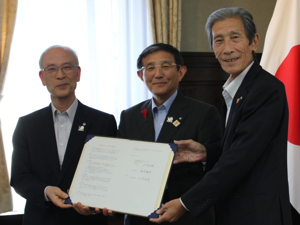 和歌山県庁知事室で行われた調印式では、仁坂吉伸知事立ち会いの下、岩田勉すさみ町長、畑中雅央由良町長と今井光規学長が協定書に調印した。