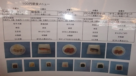 日替わりメニューは月曜日が「しゅーまいセット」、火曜日が「塩焼セット」、水曜日が「コロッケセット」、木曜日が「さわら西京焼セット」、金曜日が「チキン唐揚げセット」。どのメニューも美味しく、栄養バランスに配慮された朝食セットとなっている。