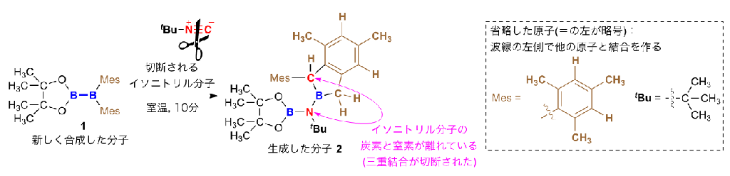 今回、炭素原子と窒素原子の間にこの強い三重結合を持つイソニトリルという有機化合物に対して、原子番号5番のホウ素原子(元素記号B)を二個含む分子(図2、新しく合成した分子1)を混ぜると、高い温度・強い酸・金属成分、のいずれも不要なままイソニトリル分子の炭素・窒素三重結合(図中に赤で示した三重線)を切断する反応が起こり、分子2ができることを明らかにした。分子2にはもともとイソニトリル分子の三重結合を形作っていた炭素原子と窒素原子が含まれるが、これらの原子は分子2の構造の中で直接結合しておらず、離れた位置にある、すなわち三重結合が切断されたことが分かる(図2のピンク矢印参照)。
