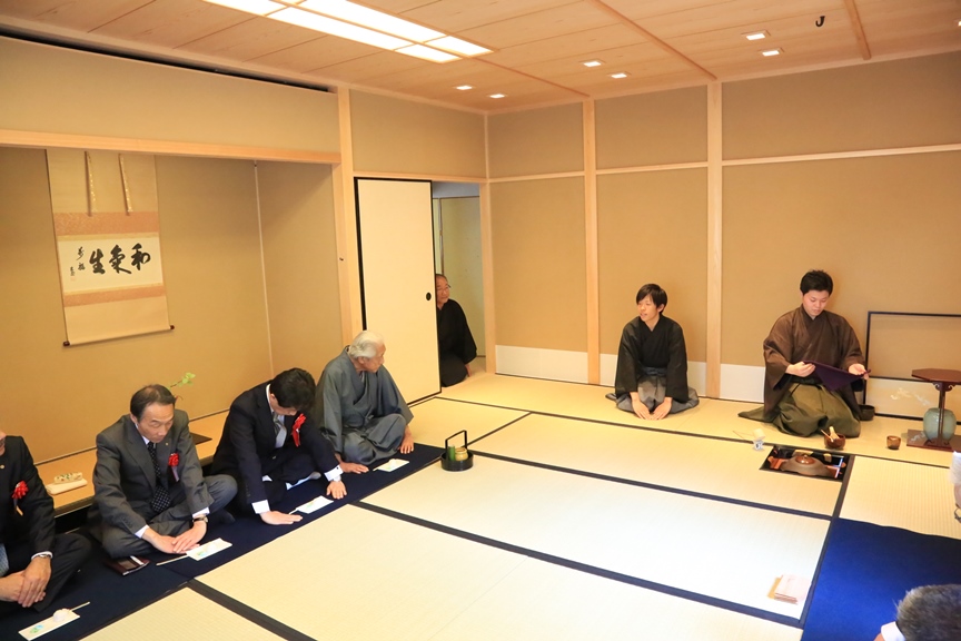 千 玄室大宗匠(裏千家 前家元)を招いて茶室披きを開催。茶道研究部の学生が呈茶で来賓をもてなす