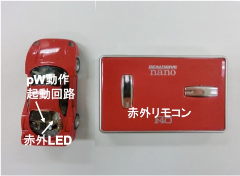 「リモコンカー」は、車に搭載したLEDに赤外線リモコンを照射するとLEDが発電し、その電力で起動回路が起動し、車が動き出す仕組み。本起動回路はLEDの発電電力で動作するため、待機電力をゼロに抑えることができ、ラジコンカー本体のスイッチも無くすことができた。