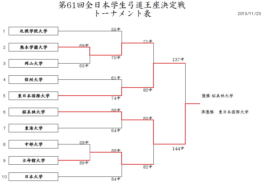 11月中旬、式年遷宮で賑わう三重県伊勢市の伊勢神宮弓道場で開催された「日本学生弓道王座決定戦」および「全日本学生弓道女子王座決定戦」は、弓道における今年の大学頂点を決める大会。各地区の激戦を勝ち抜いて集った代表9校、および「全日本学生弓道選手権大会」での優勝校計10校によるトーナメント戦で行われた。