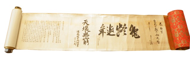 主な見所として挙げたいのは、後の大正天皇となる嘉仁親王が結婚した際個人の祝言を集めて巻物にして、親王へ贈られた『婚姻奉祝』(藤井有鄰館所蔵)です。嘉仁親王の結婚式は、神前式結婚のはじまりで、それが契機となり庶民へ神前式結婚式が広まります。