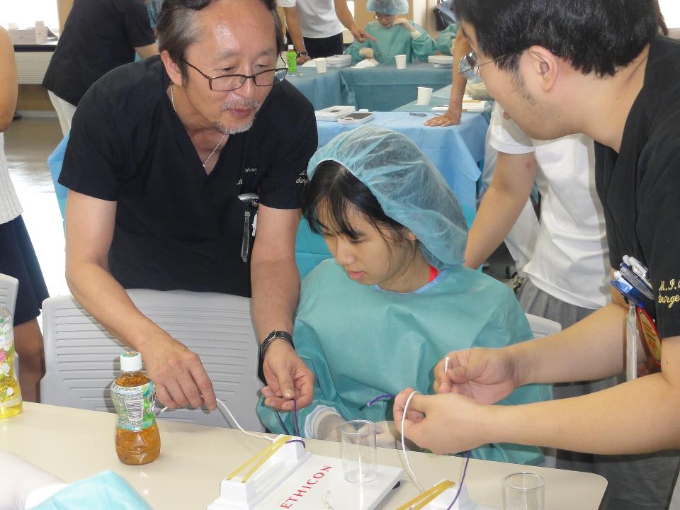 昨年の同セミナーには、地域在住の小学生と中学生あわせて35人が参加。術衣を着用し、手術用針・糸を使った縫合・結紮体験やスポンジを使った模擬手術体験などを行った。