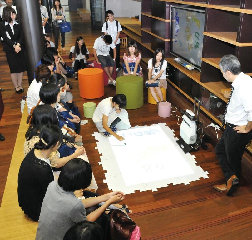 昨年7月に完成したICCには、床に書いた絵や文字をディスプレイに写せる「e黒板」など、子どもたちが楽しく学べるセミナールームや装置を備えている。小学校で5、6年生の外国語活動が必須となり、低年齢層からの英語教育が検討される中で、ICCの活用が検討されていた。 ICC完成後、小学生以下が対象の本格的な講座の開講は今回が初めて。開講日は、6、13、20日の3日間で、休憩を含め午後1時半~5時に行われる。