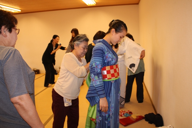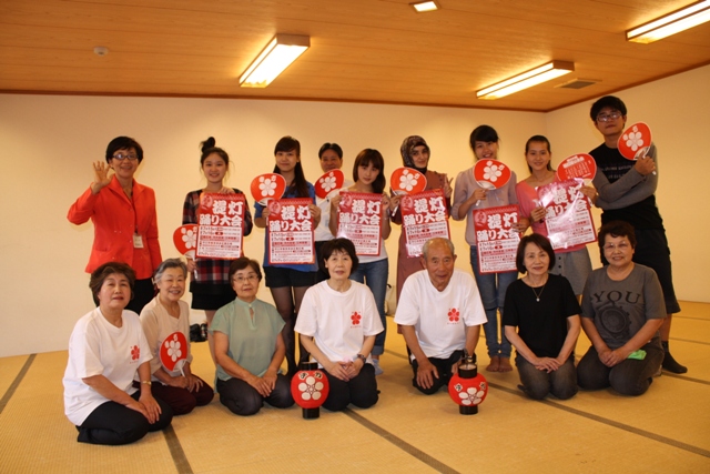 地域との連携を進める大阪国際学園の地域連携室と、大阪国際大学国際交流課が協力。芸術、文化の普及に努める守口市議の井上てるよさんの協力もあって、守口市郷土芸能寺方提灯踊り保存会から石田実会長ら3人が踊りの振り付けを指導、ボランティア団体「元気おばちゃんず」のお母さん4人が、浴衣の着付けの応援に駆けつけた。