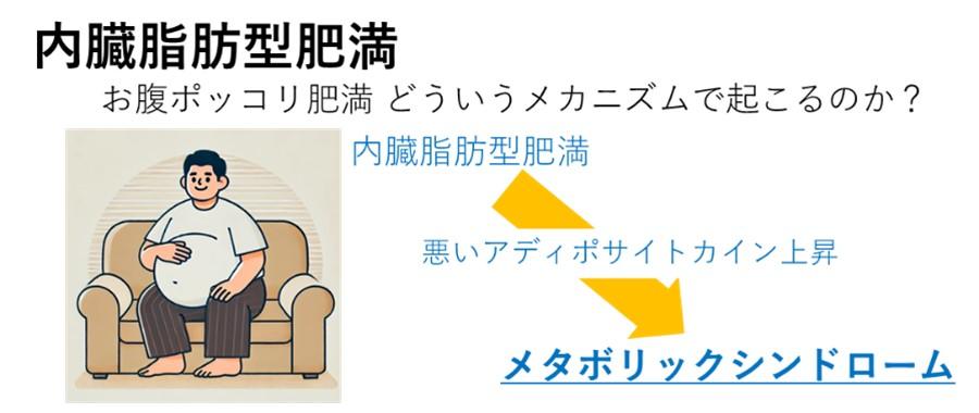 肥満は脂肪組織に脂肪が大量にたまることを指すが、脂肪がたまる場所により、大きく二つに分けられる。皮下脂肪にたまる肥満を皮下脂肪型肥満と呼び、お腹の中に脂肪がたまる肥満を内臓脂肪型肥満と呼ぶ。この内臓脂肪型肥満は、お腹ポッコリ肥満であり、悪いアディポサイトカインを放出するため、生活習慣病につながることが分かっている。