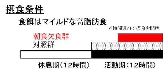 本研究では、マイルドな高脂肪食を不活動症候群モデルラットに与え、朝食を欠食させる群とそうでない群を設けて比較しました(図2)。