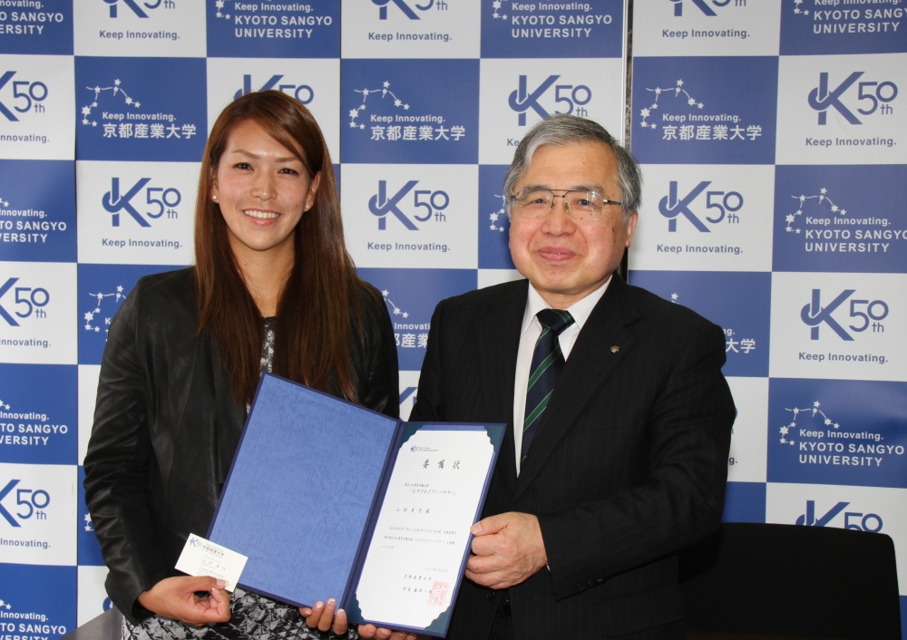「むすびわざ」とは、京都産業大学の「産業」を「産(む)すび業(わざ)」と読み解き、モノ・コト・ヒトを新しい発想で「むすび」、新たな価値を「産み出す」という意味がある。山田氏は「むすびわざアンバサダー」として、地域・社会と大学の懸け橋としての活躍が期待される。