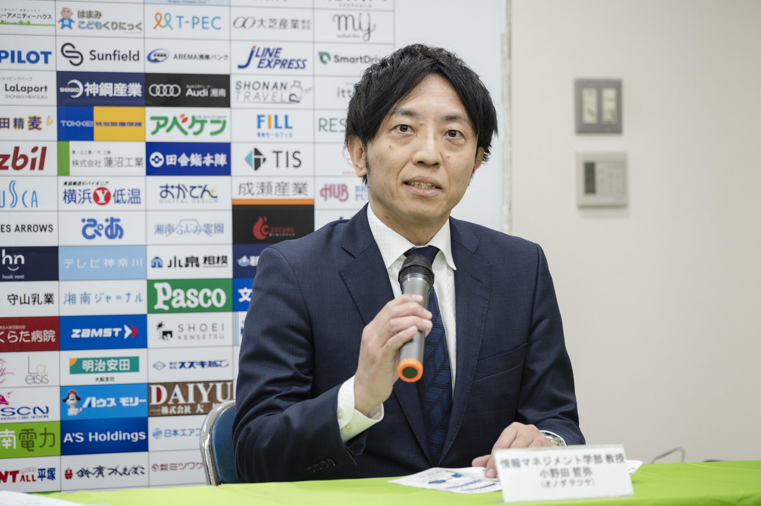 新科目開講に先立ち、2025年2月26日(水)にレモンガススタジアム平塚 記者会見ルームにて記者発表会を開催しました。当日は、学長 鬼木和子、新科目の担当教員である情報マネジメント学部教授 小野田哲弥のほか、湘南ベルマーレ 代表取締役社長 坂本紘司氏、代表取締役副社長 大多和亮介氏が登壇いたしました。