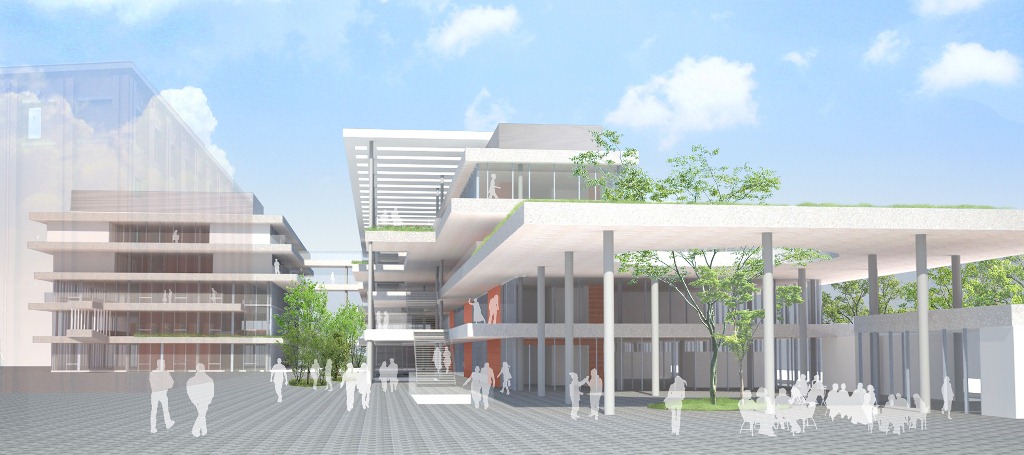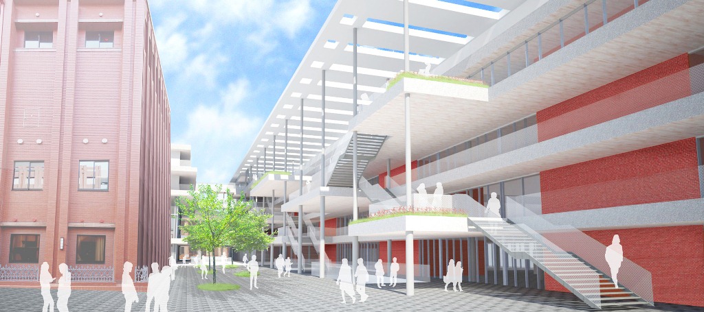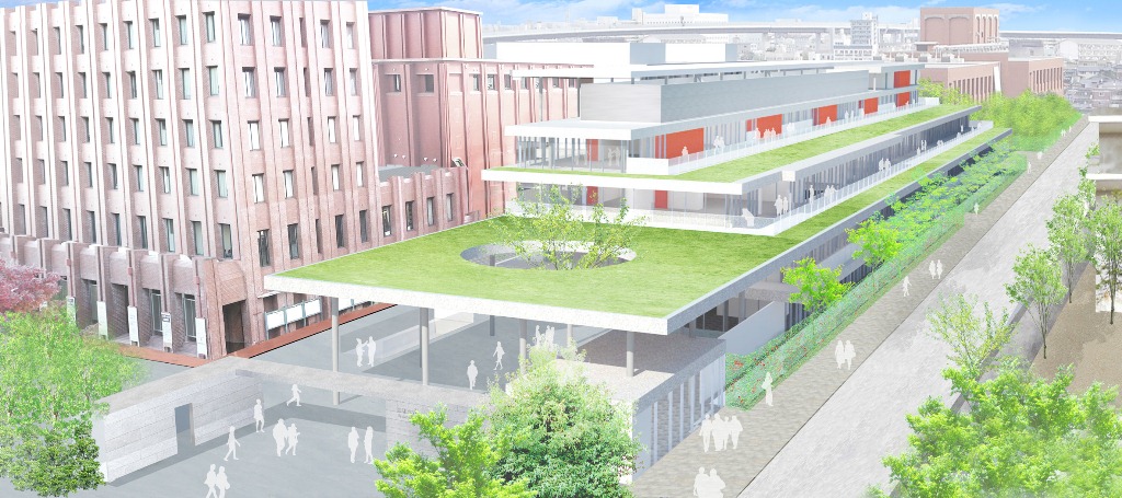 今般、5長施策の1つである、2015年4月の「国際文化学部の深草キャンパスへの移転」に伴い必要となる研究室や教室等を整備するとともに、学生の主体的な活動の支援や優れた研究基盤の形成、多文化共生キャンパスの実現などに資する、新棟「新1号館(仮称)」を建設する。