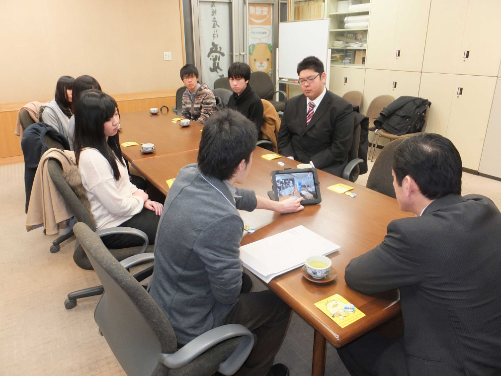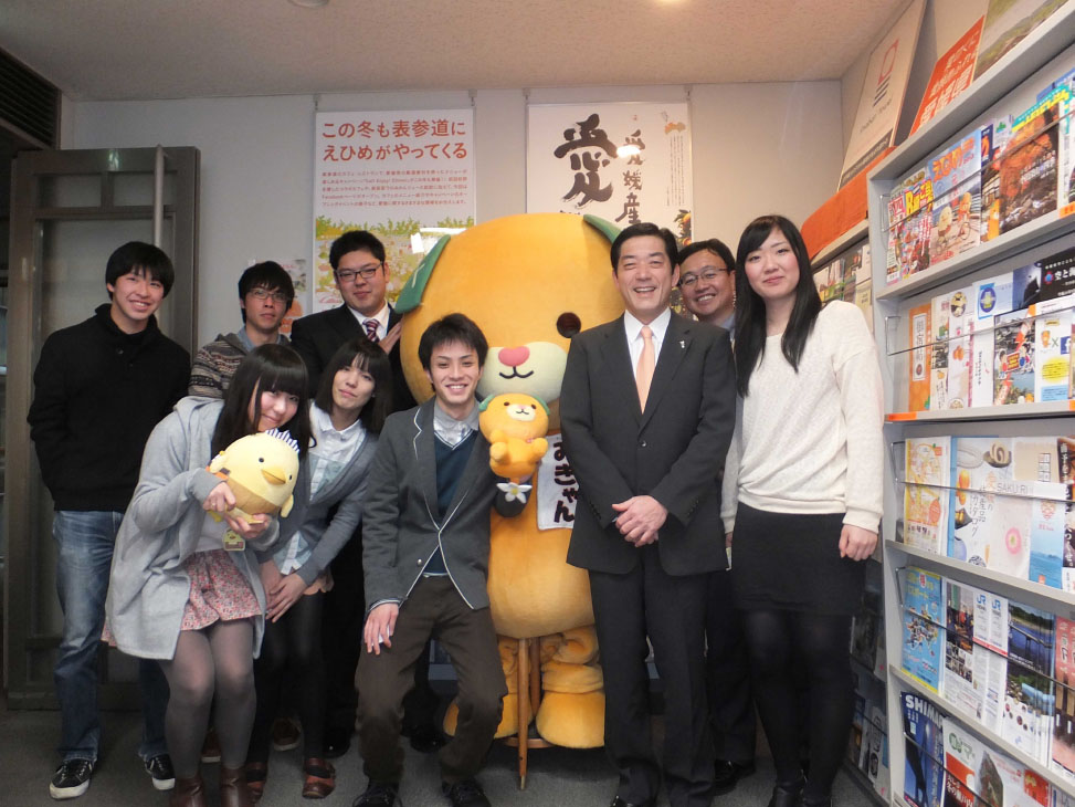 去る平成25年2月15日(金)、横浜商科大学(神奈川県横浜市鶴見区 学長 柴田悟一)の宍戸ゼミ3年生(観光学専攻 指導教員 貿易・観光学科 宍戸 学 准教授)一行は、愛媛県東京事務所にて中村時広愛媛県知事に、平成24年9月に実施した夏期調査合宿報告を行った。