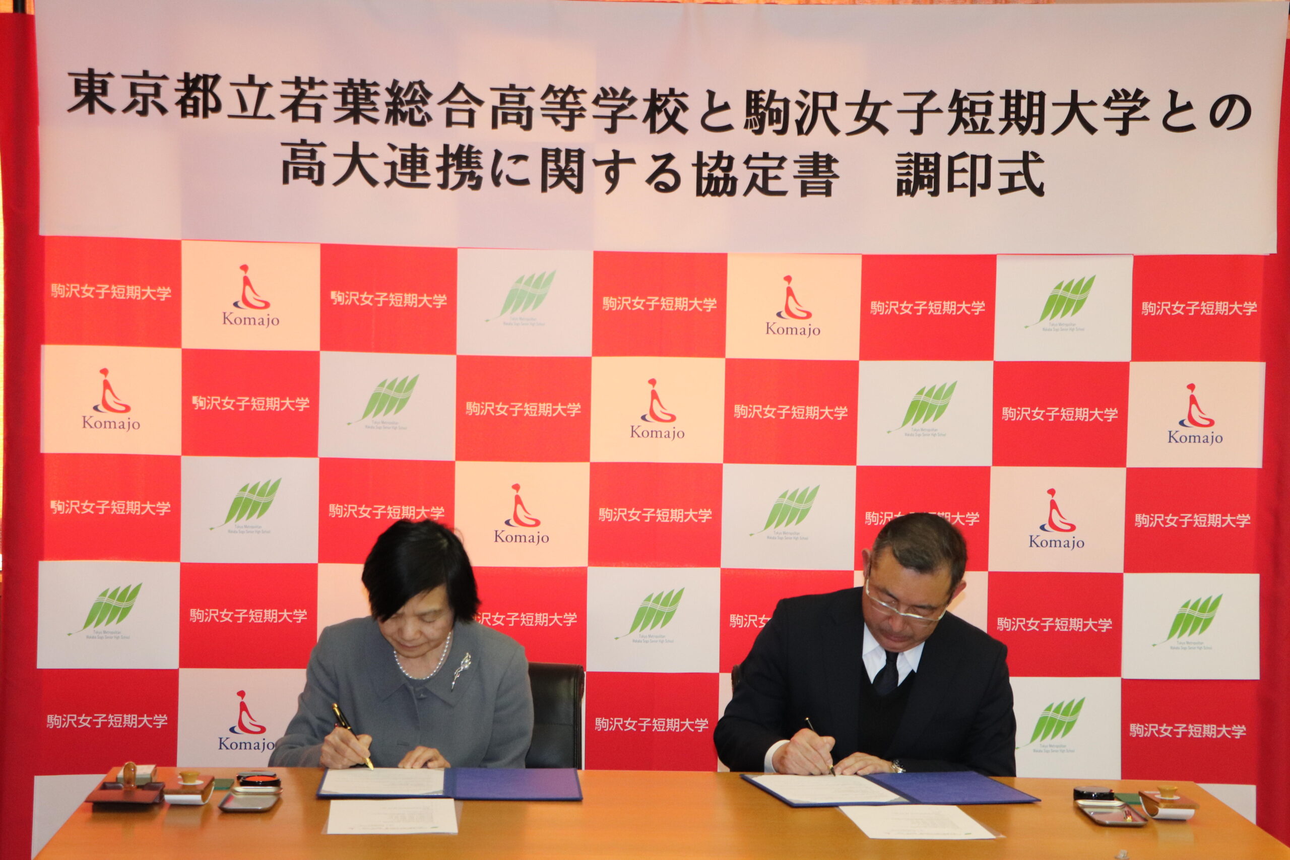 駒沢女子短期大学(東京都稲城市/学長:臼井実稲子)と東京都立若葉総合高等学校(東京都稲城市/校長:山室俊浩)は高大連携協定を締結し、2月14日に調印式を執り行った。今後は協定に基づき、模擬授業、研究室訪問及び探究活動での連携や、社会貢献活動、課外活動における交流、教育についての情報交換及び交流等を推進していく。
