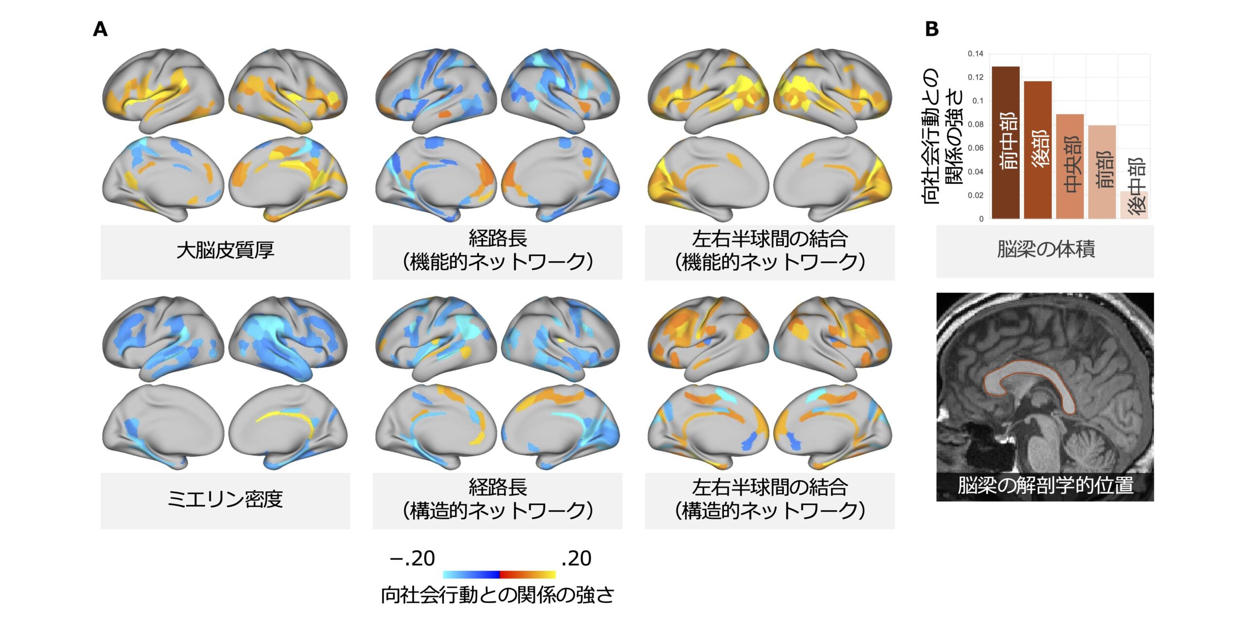 さらに、皮質厚が厚く、ミエリン密度が低い(非髄鞘成分が増加している可能性を示す)という特徴も確認され、主に社会性に関わる領域(側頭頭頂接合部など)で顕著でした。これらの領域が、向社会行動において重要な役割を果たしていると考えられます。