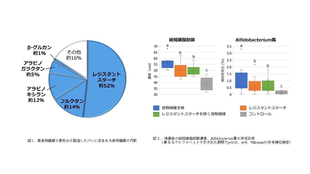 高食物繊維小麦粉に含まれるレジスタントスターチ、及びその他の食物繊維は、腸内発酵性があり、短鎖脂肪酸産生菌であるBifidobacterium属の存在比率を増加させるなどの腸内環境改善効果が培養試験において確認されました。また、レジスタントスターチと複数の発酵性食物繊維が含まれることでその効果が向上することが明らかになりました(添付図2)。