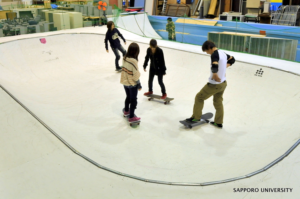 しかし、このスケートボードランプは初心者にはサイズが大きすぎたため、2011年4月に、初心者でも楽しめるようミニスケートボードランプ(幅5400mm、高さ900mm)を設置。11月には、顧問とプロスノーボーダー等の有志の協力により、ミニスケートボードランプを改良し、すり鉢状の「スケートボードボウル」にリニューアルした。