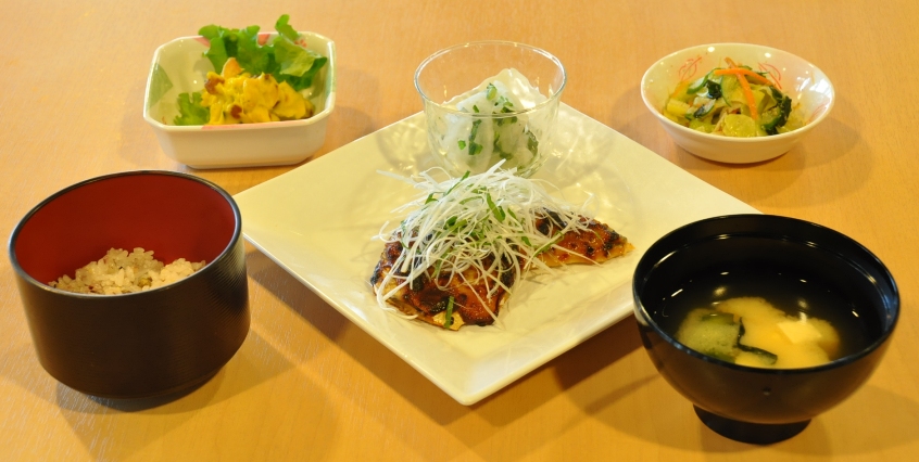 同大では4月16日(月)からの通常販売に先駆け、3月27日に20食限定で試験販売を行った。当日のメニューは、さばのねぎ味噌焼き・キャベツのごま味噌和え・南瓜のスイートサラダ・味噌汁・お豆と雑穀のご飯。ランチを食べた学生は「味がしっかりしていて、とても美味しかった。ヘルシーメニューで物足りない感じがするのかと思いましたが、ボリュームもありました」と納得の表情だったという。