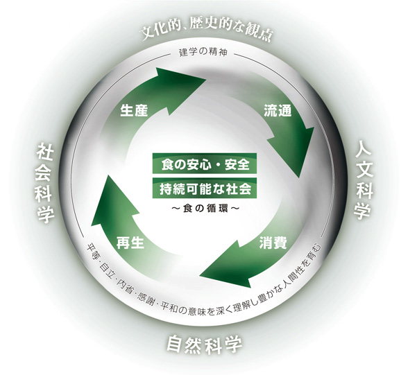 農学部(仮称)は、「食の循環」にかかる教学展開を通じて「食の安心・安全」及び「持続可能な社会」の実現を図る教育をめざす。その根底には、「いのち」を支える「食」のあり方を捉え、建学の精神に基づいた人間教育を通じて、本学独自の人間育成を図る点に特徴がある。ここでは、人文科学・社会科学・自然科学すべての領域を総合した4学科構成による教学展開を図り、学部としての学際性を高めながら、多様な観点から偏りのない教育・研究を行う予定である。こうした人間を育むことに軸足を置いた学際性の高い農学教育は、他大学にはみられない大きな特色である。