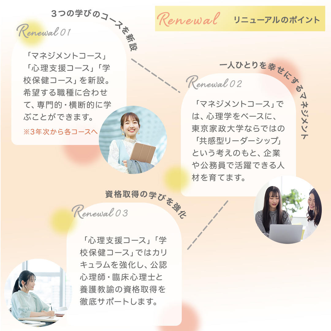 「学校保健コース」「心理支援コース」では、東京家政大学の強みである「人を支える専門職」の育成課程を強化し、養護教諭と公認心理師・臨床心理士を目指すためのカリキュラムを強化。公認心理師・臨床心理士資格取得のため、大学院までの6年間一貫教育も整備される。