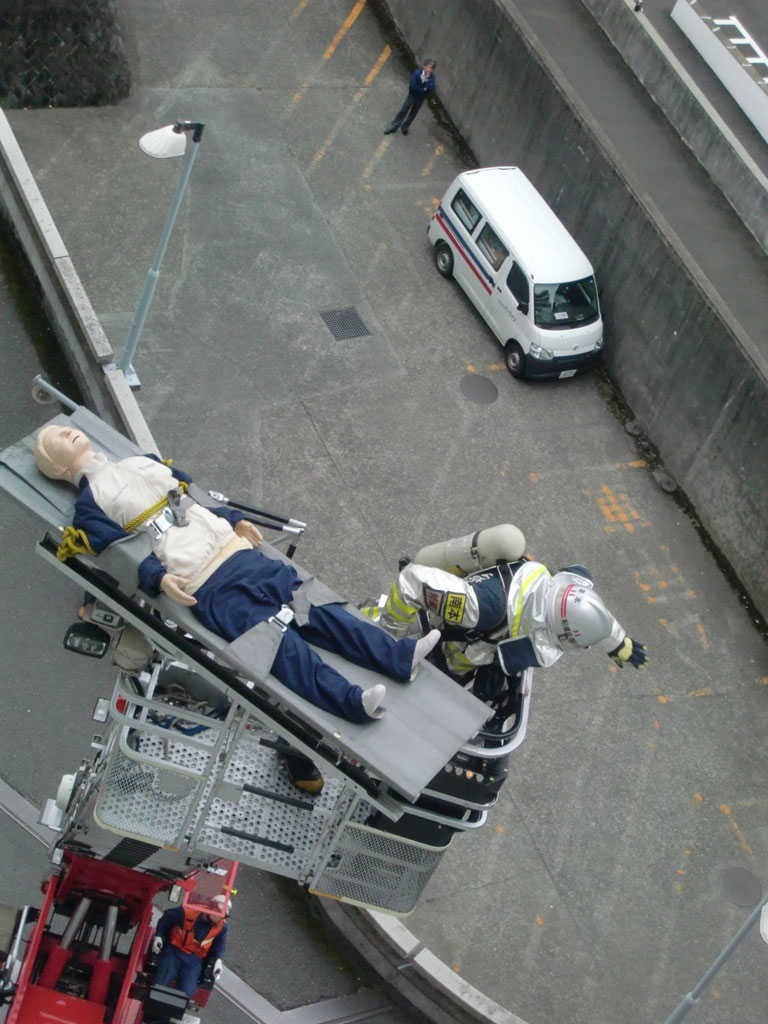 また、附属病院では避難者や模擬患者に対してのトリアージを行ったほか、医師がはしご車で建物の上にのぼり現場で直ちに診療を行う残留者救助など、実践的な訓練を行った。