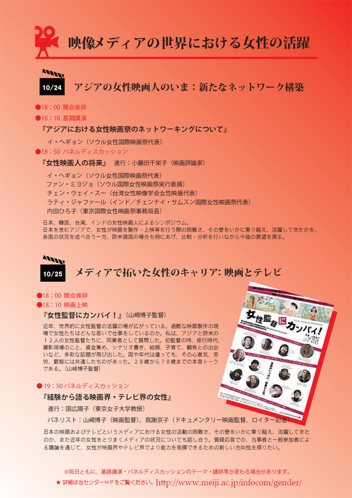 10月24日(月)は「アジアの女性映画人のいま:新たなネットワーク構築」を主要テーマに、ソウル国際女性映画祭代表のイ・ヘギョン氏が「アジアにおける女性映画祭のネットワーキングについて」と題して基調講演を行うほか、映画評論家・小藤田千栄子氏の進行によるパネルディスカッション「女性映画人の将来」を実施する。