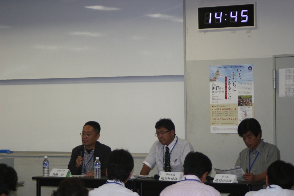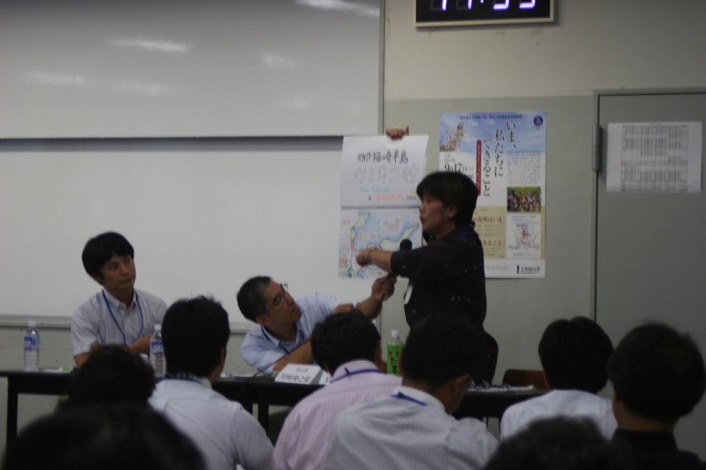 石巻市・釜石市・気仙沼市から、現場で復興活動に携わっている地元住民6名をゲストに迎え、同大教員との対談を通して、現地での復旧や復興における自らの体験談を語っていただいた。また、被災住民の復興に対する真摯な思いを直接理解するために活動展示コーナーも設けられた。その震災直後の生生しい被害の実態、各立場における復興活動に向けた活動と強い決意を込めた生の声は、多くの参加者の共感を呼ぶこととなった。