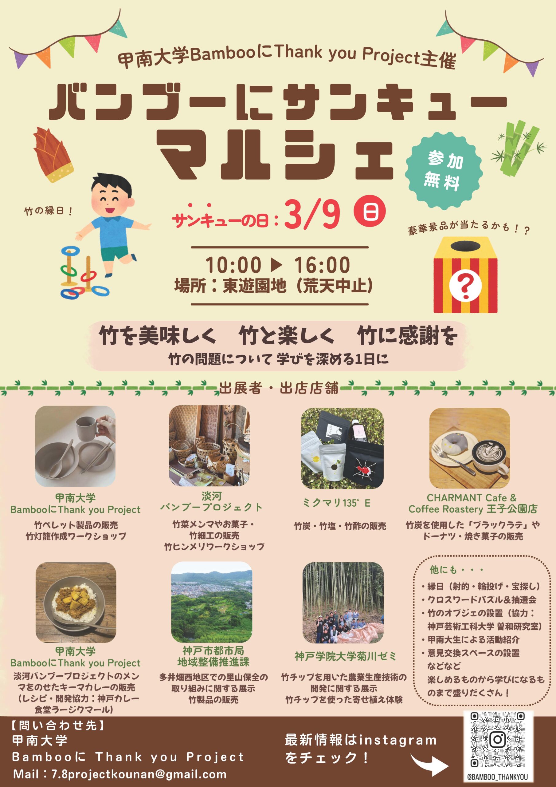 竹は繁殖力が強く、管理者の高齢化や担い手不足等により管理放棄された「放置竹林」は土砂災害を引き起こす危険性があり、全国的に問題になっています。本学の学生による、神戸市の放置竹林問題の解決を通じてSDGsの達成を目的に活動する「BambooにThank you Project」は、竹炭を使ったフードメニューの考案や竹のクリスマスツリー製作など、精力的に活動を続けてきました。このたび、クラウドファンディングによる支援を得て、プロジェクト初となる主催イベント「バンブーにサンキューマルシェ」を、3月9日(日)に神戸市の東遊園地にて開催いたします。