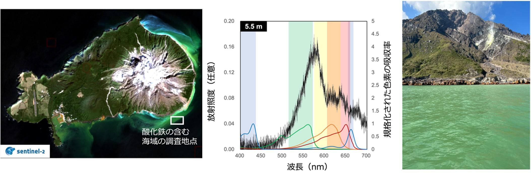 シアノバクテリアの進化の模擬実験によって、緑の光環境と緑の光を吸収するビリン色素と強い結びつきがあることが分かり、緑の光環境が色素の選択圧として働いた可能性を実験的に示しました。シアノバクテリアの分子系統樹解析によって、その共通祖先が緑の光を集光する色素を利用した光合成を行っている可能性が高いことが明らかになりました。また、量子化学計算からシアノバクテリアが緑の光を効率よく集めるアンテナの仕組みを解明しました。さらに、太古代と類似の環境である薩南諸島の硫黄島海域(図3左)において光環境や生物分布の調査を実施しました。酸化鉄によって水中で緑の光環境が形成されていることを確認し(図3中央)、緑の光環境では緑の光を吸収する光合成生物が多く存在することも分かりました。