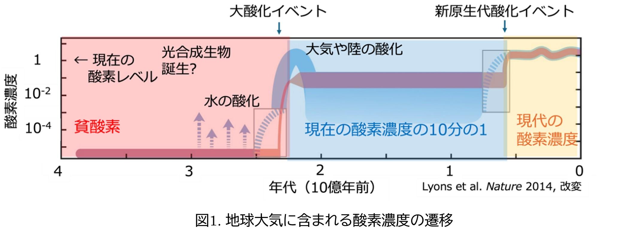 地球は生命の誕生以降、生命とともに進化してきました。その代表的な指標が表層の酸化です(図1)。地球誕生当時、表層の酸素濃度は現在と比べて100万分の1程度でした。約30億年前に酸素を発生する光合成生物が水中で誕生して以降、水中で酸化が始まり、水中の酸素濃度が上昇しました。水中の酸素が飽和すると大気に酸素が放出され、約24億年前に「大酸化イベント」と呼ばれる、大気の酸素濃度が現在の数パーセント程度まで上昇する出来事がありました。この大酸化イベントからほどなくして、好気呼吸によって効率よくエネルギーを獲得する真核生物が誕生しました。生物の進化・多様化が停滞する退屈な10億年を経て、7 – 5億年前に再び大気の酸素濃度が急上昇して現在の濃度に落ち着きました。また、大気の酸素濃度の上昇によって多細胞動物の誕生が促されました。このように、地球の表層における酸素濃度と生命の進化は密接な関係があると考えられています。