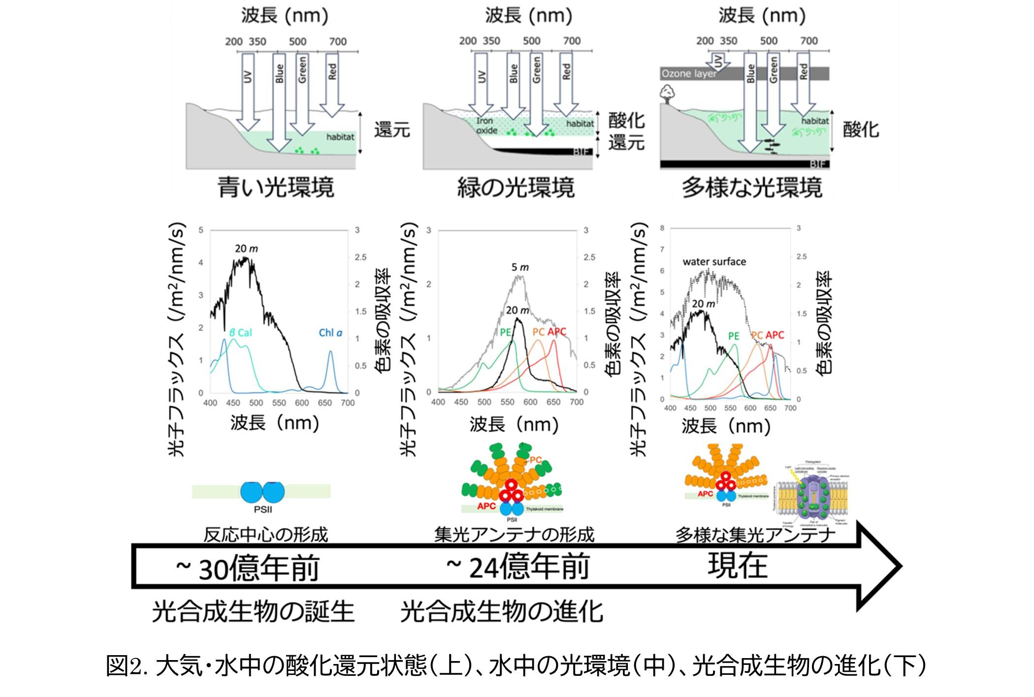 ・太古代(注5)の水中の光環境が光合成生物の放出した酸素により緑に変わることを明らかにした。